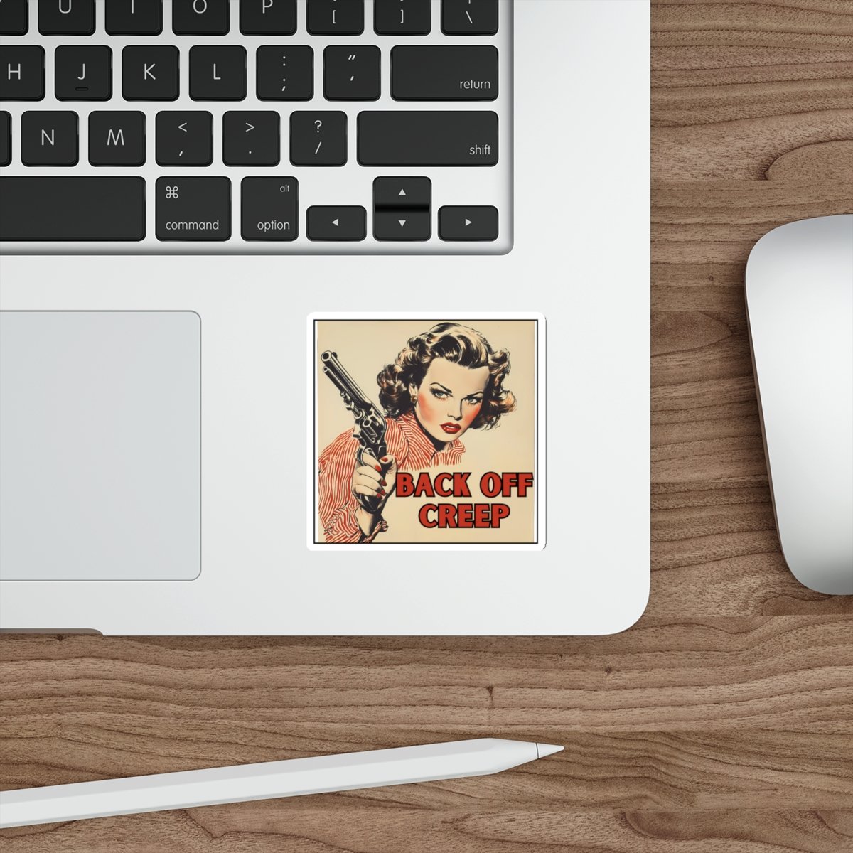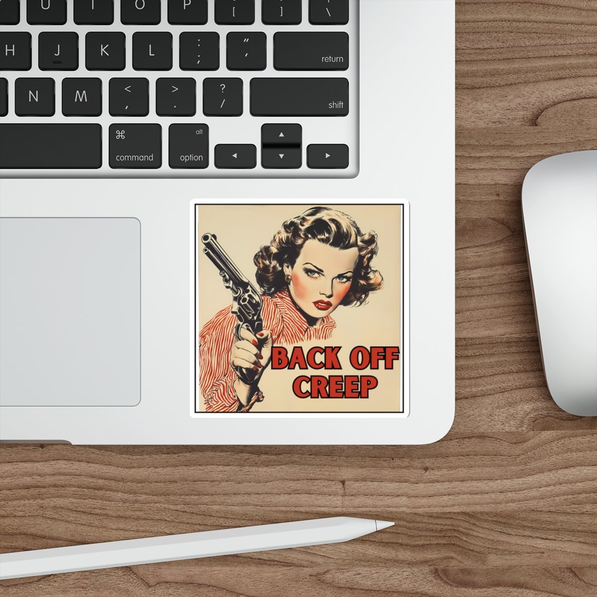 Funny vintage illustration sticker with a bold message - 'Back off creep, women with gun'. Perfect for those who appreciate quirky and humorous designs. Ideal for sticking on laptops, notebooks, water bottles, and more. Great for those who enjoy unique and sassy accessories.