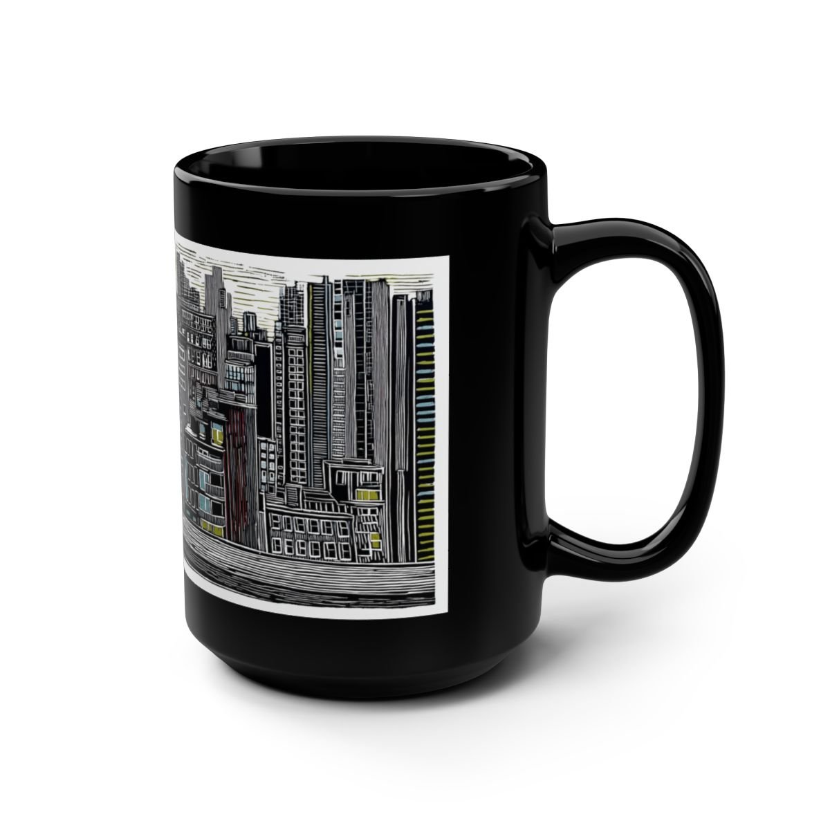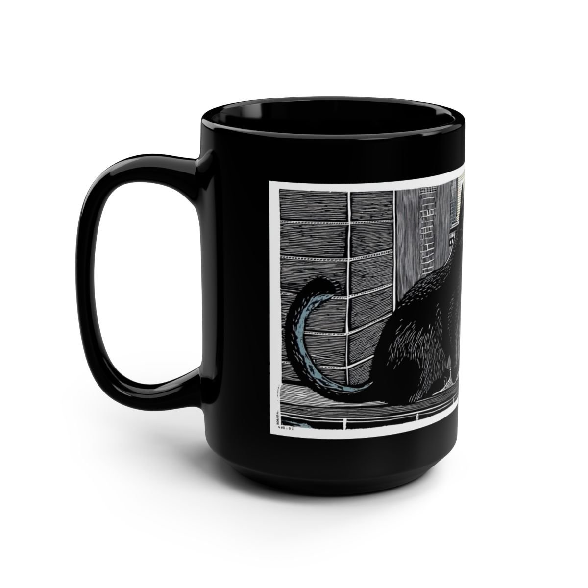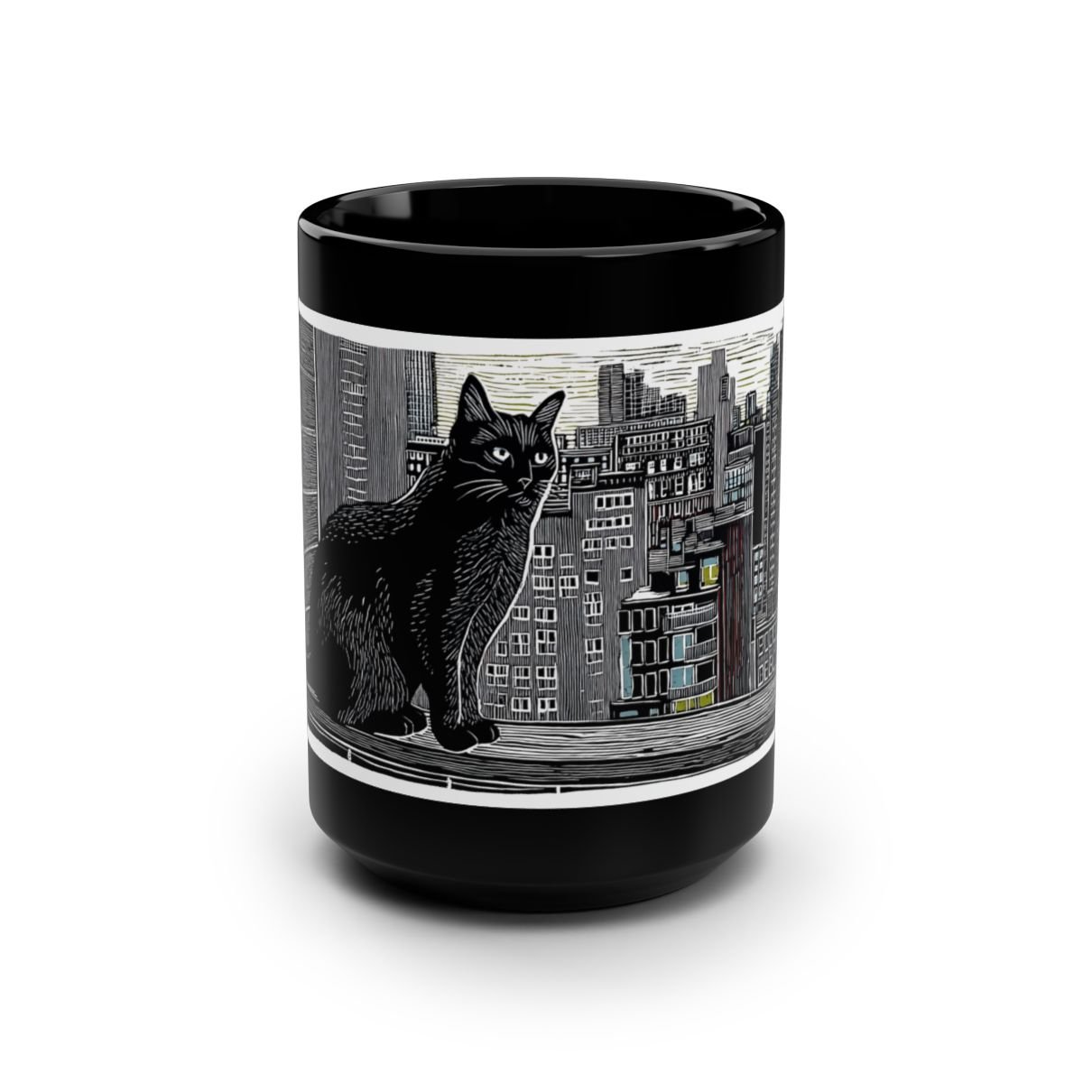 Black Cat Cityscape Mug, 15oz Ceramic Coffee Cup, Cat Lover Gift, Urban Cat Design, Cozy Ho-5ac7338e