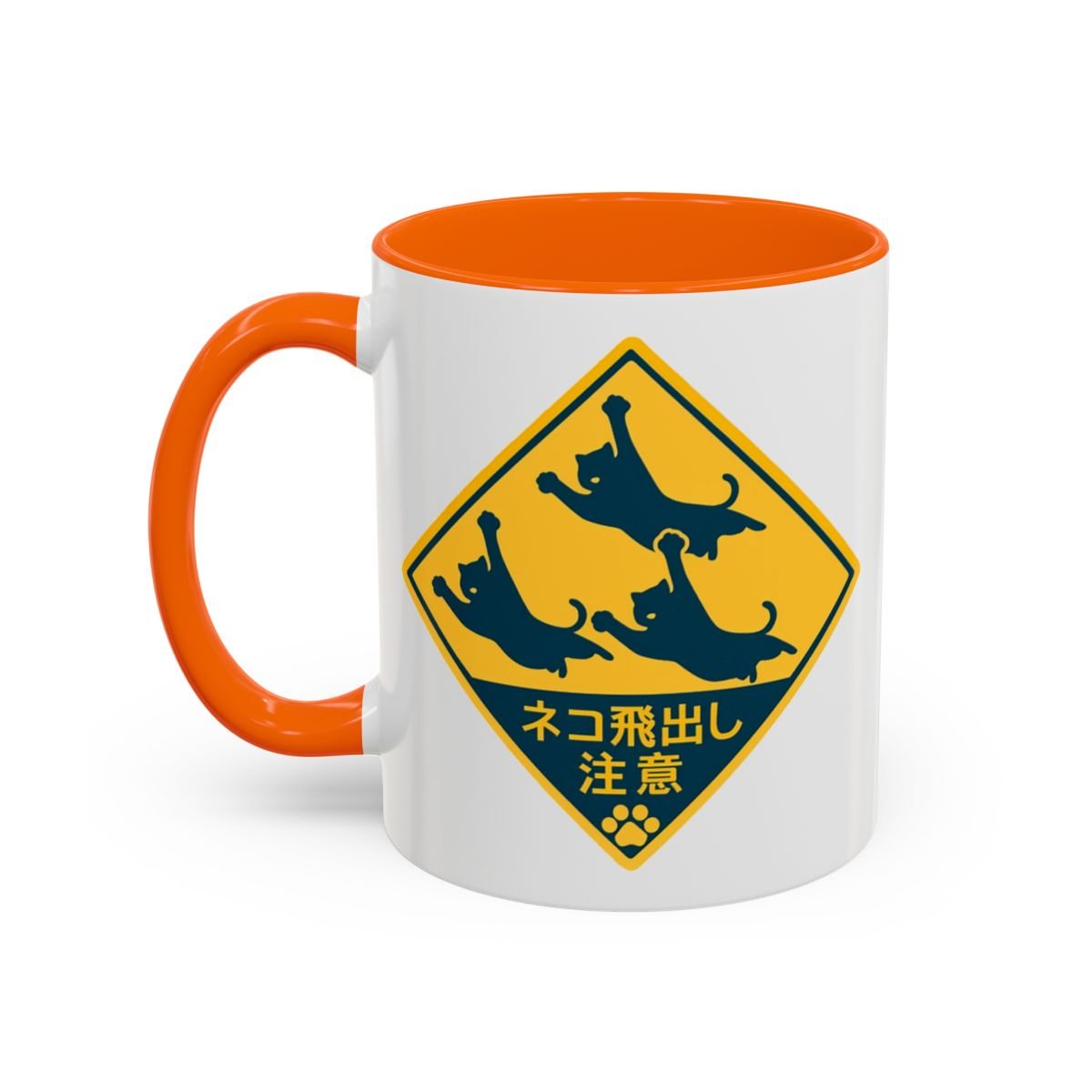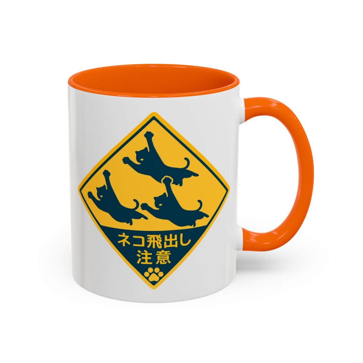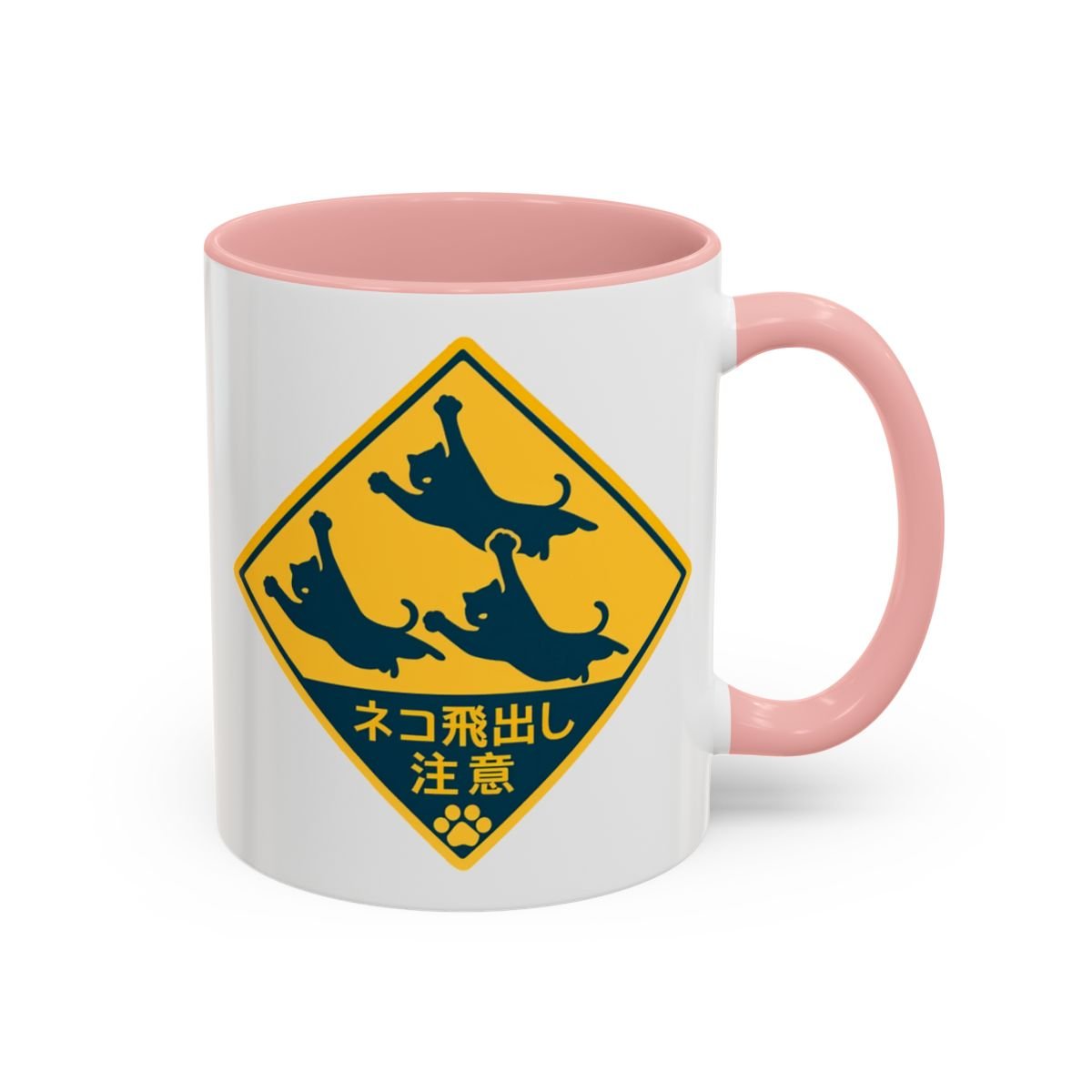 This Japanese cat coffee/tea mug features a cute design with a Japanese road sign that translates to: "Beware of cats jumping out". Perfect for cat lovers who enjoy a touch of Japanese culture in their everyday items. Ideal for cozy mornings or relaxing evenings with a hot beverage. Relevant for cat lovers, Japanese culture enthusiasts, and those who enjoy unique mugs. Great for gifting during holidays, birthdays, or special occasions.