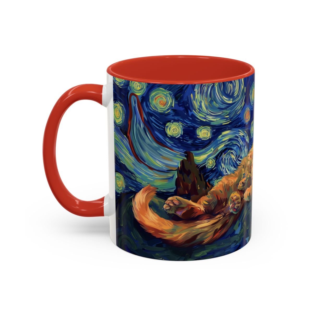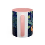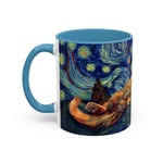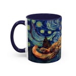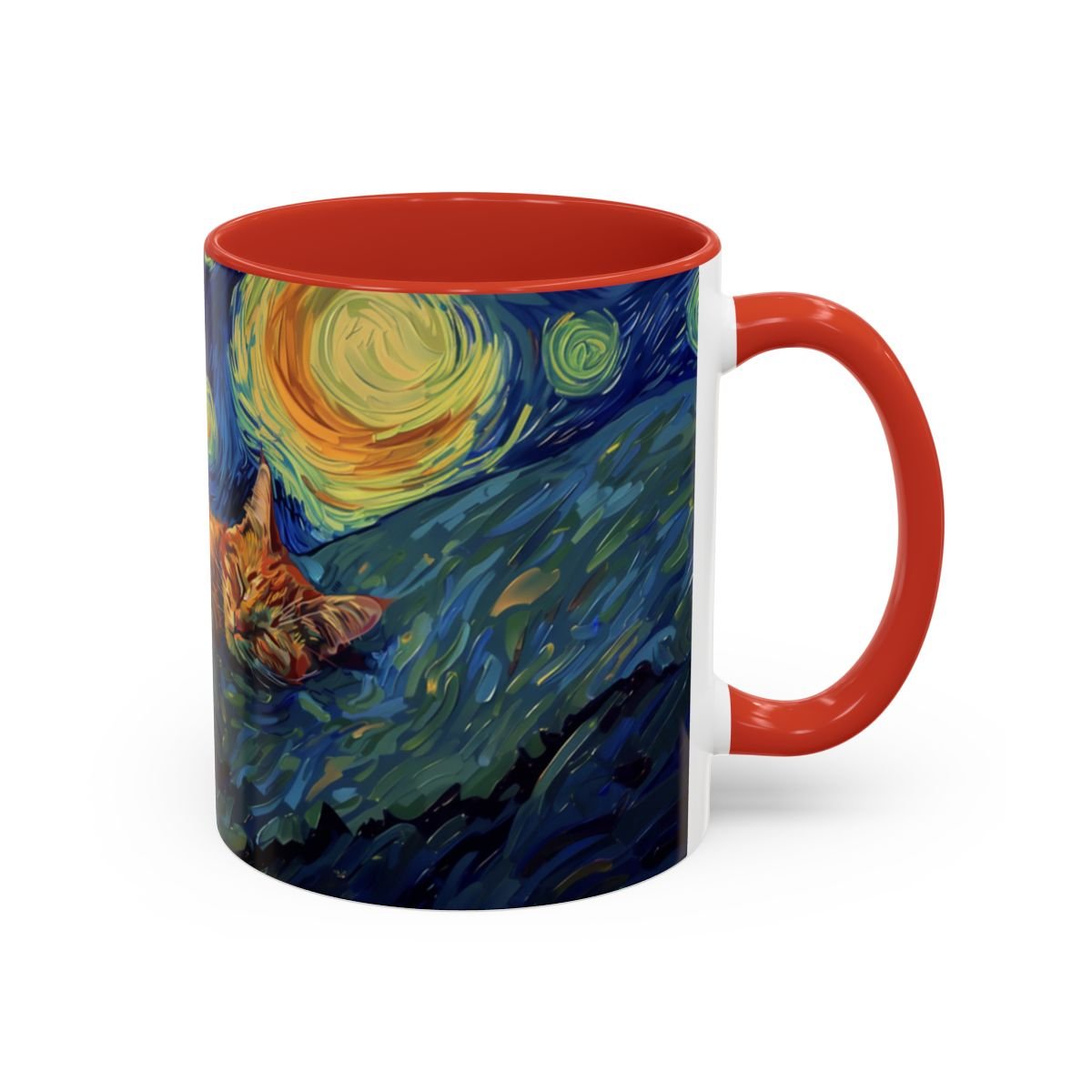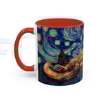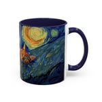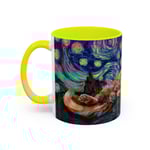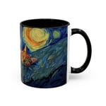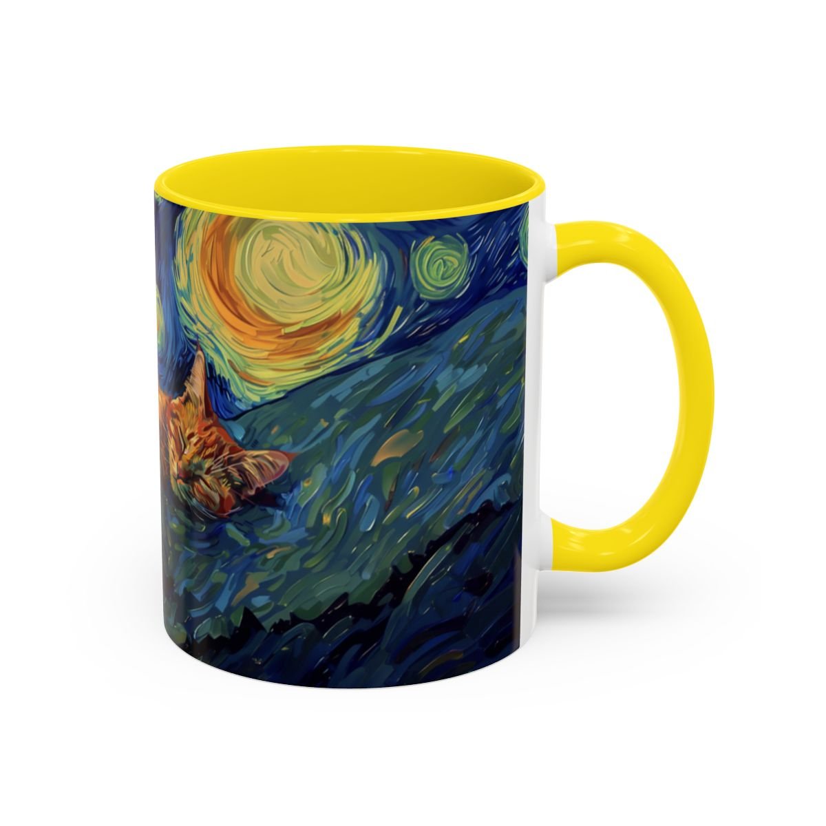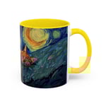 This ceramic accent mug brings a little gallery to your morning routine. The glossy, high-contrast print wraps around the mug, showing a sleepy orange cat curled into the swirls of a Starry Night–inspired sky. Deep navy and vibrant golds make the artwork pop against the colored interior and handle, so your coffee looks as artful as it tastes. It feels sturdy in the hand thanks to the C-shaped handle and the balanced weight of ceramic. Use the 11 oz for a quick espresso or the larger 15 oz when you need an extra pour — either way the colors stay bright through daily dishwasher and microwave use. Lead- and BPA-free, this mug blends practical durability with a cozy, dreamy aesthetic that slips easily into quiet mornings, late-night sketch sessions, or relaxed weekends at home.