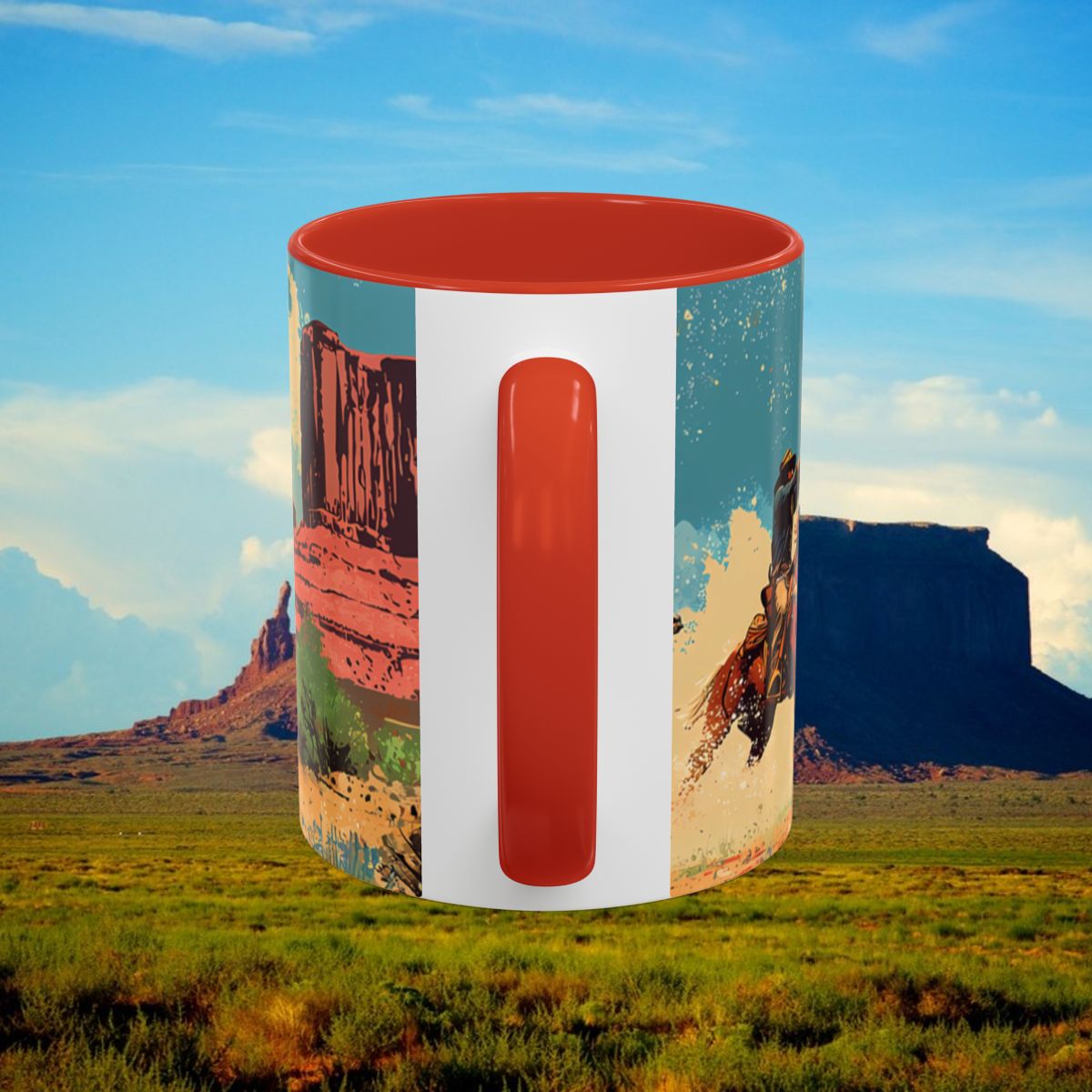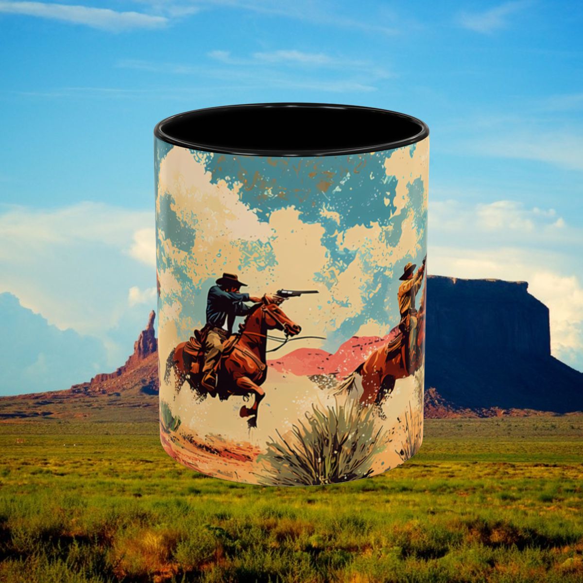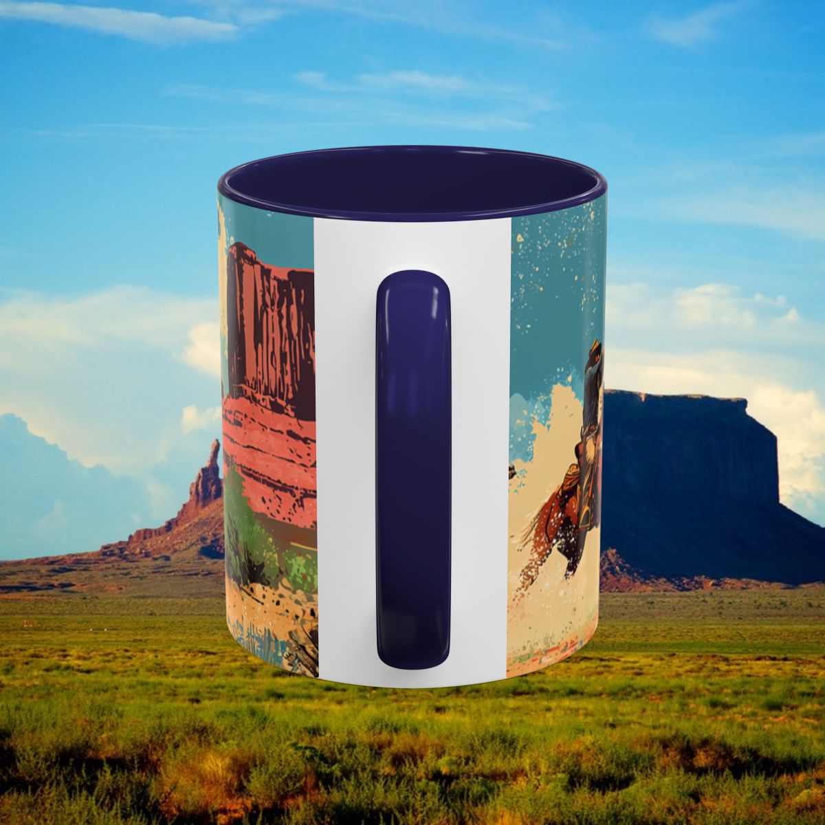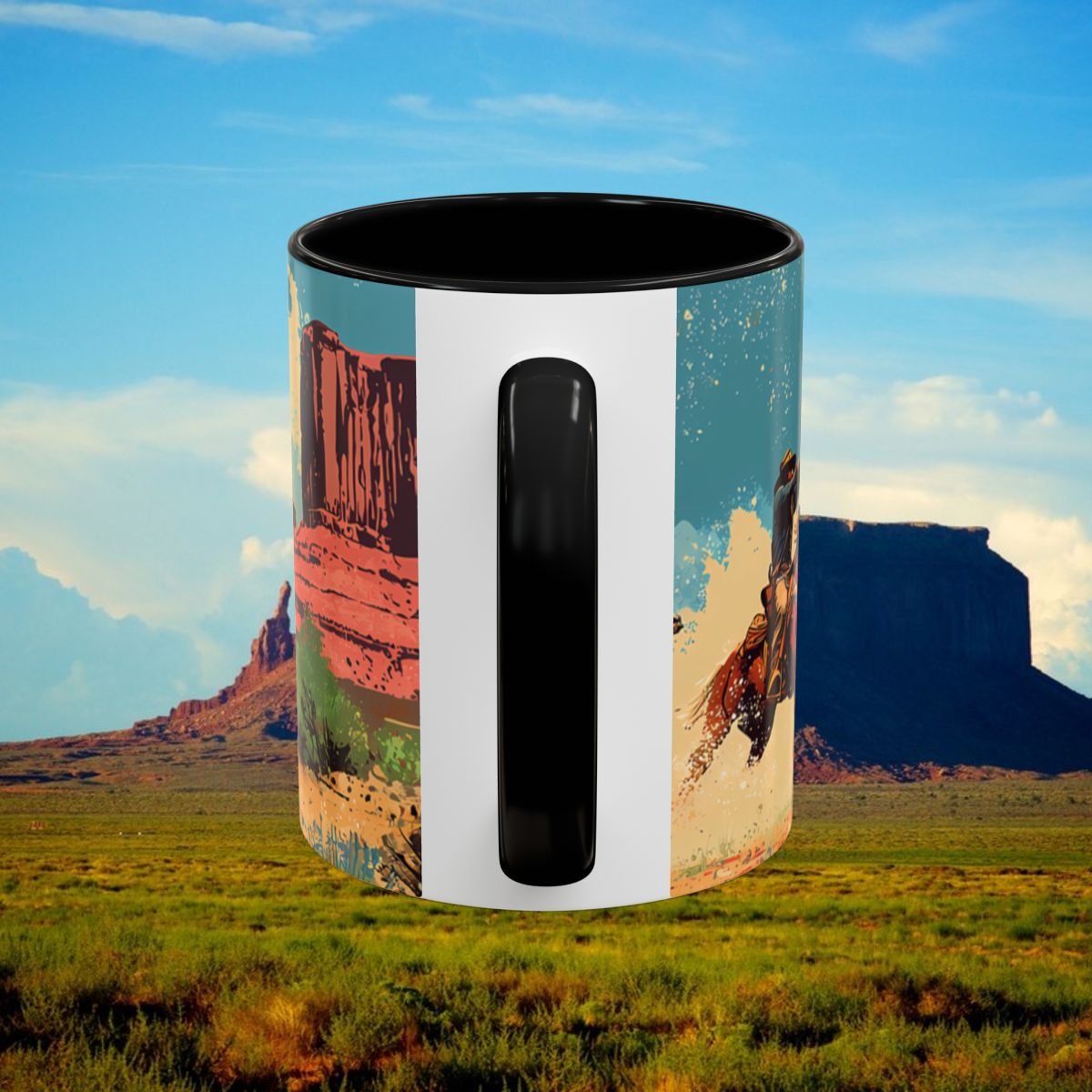 Embrace the cowboy southwestern western old west vibes with this accent coffee mug. Perfect for those who love rustic, vintage, and western themes. Ideal for those who enjoy sipping their morning coffee or tea while daydreaming about the wild west. Relevant for cowboys, cowgirls, and fans of western movies and TV shows. Great for Western-themed parties, cowboy festivals, and rodeo events.