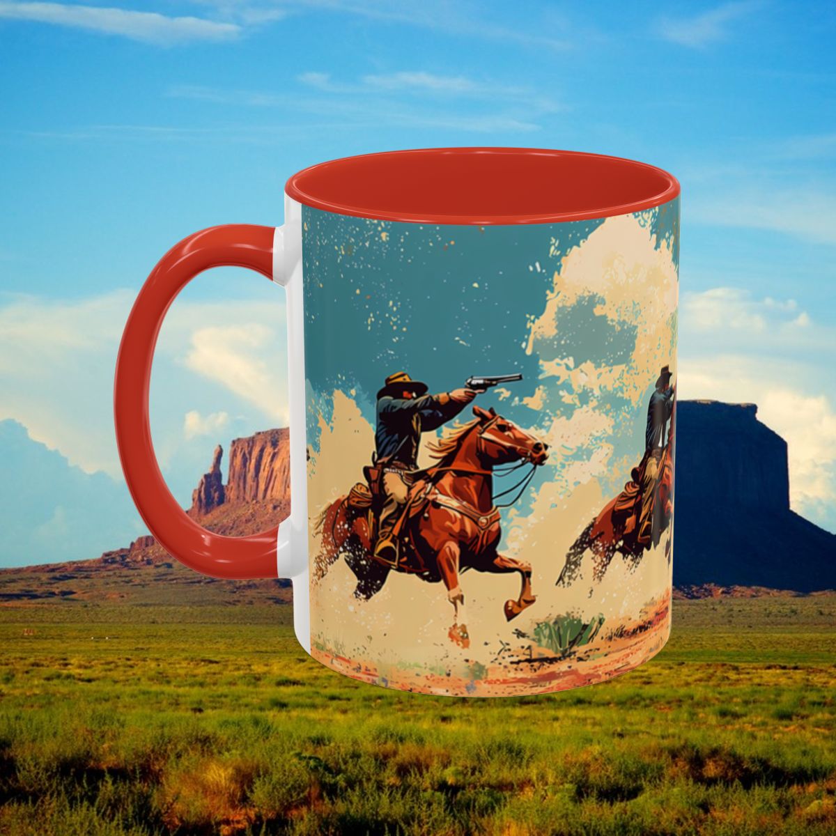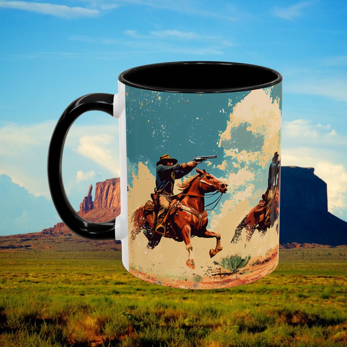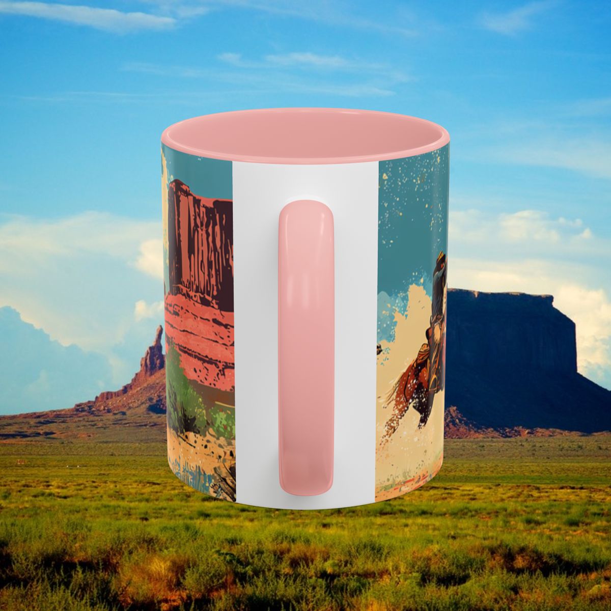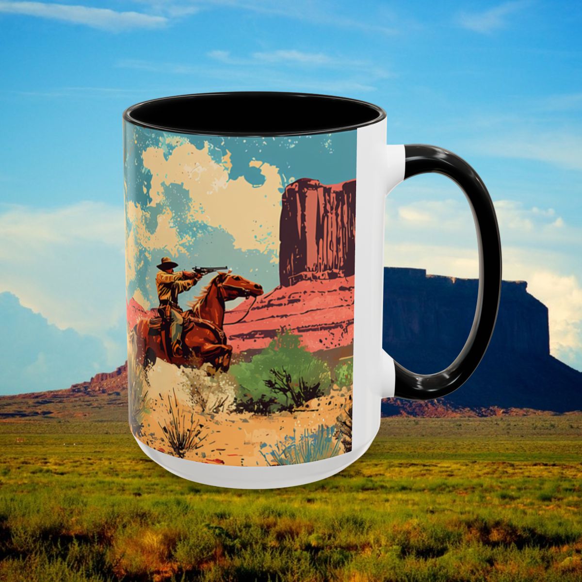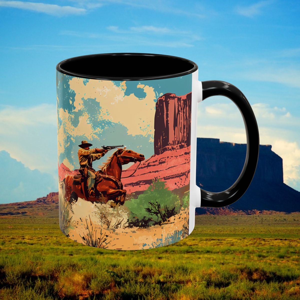 Embrace the cowboy southwestern western old west vibes with this accent coffee mug. Perfect for those who love rustic, vintage, and western themes. Ideal for those who enjoy sipping their morning coffee or tea while daydreaming about the wild west. Relevant for cowboys, cowgirls, and fans of western movies and TV shows. Great for Western-themed parties, cowboy festivals, and rodeo events.