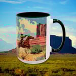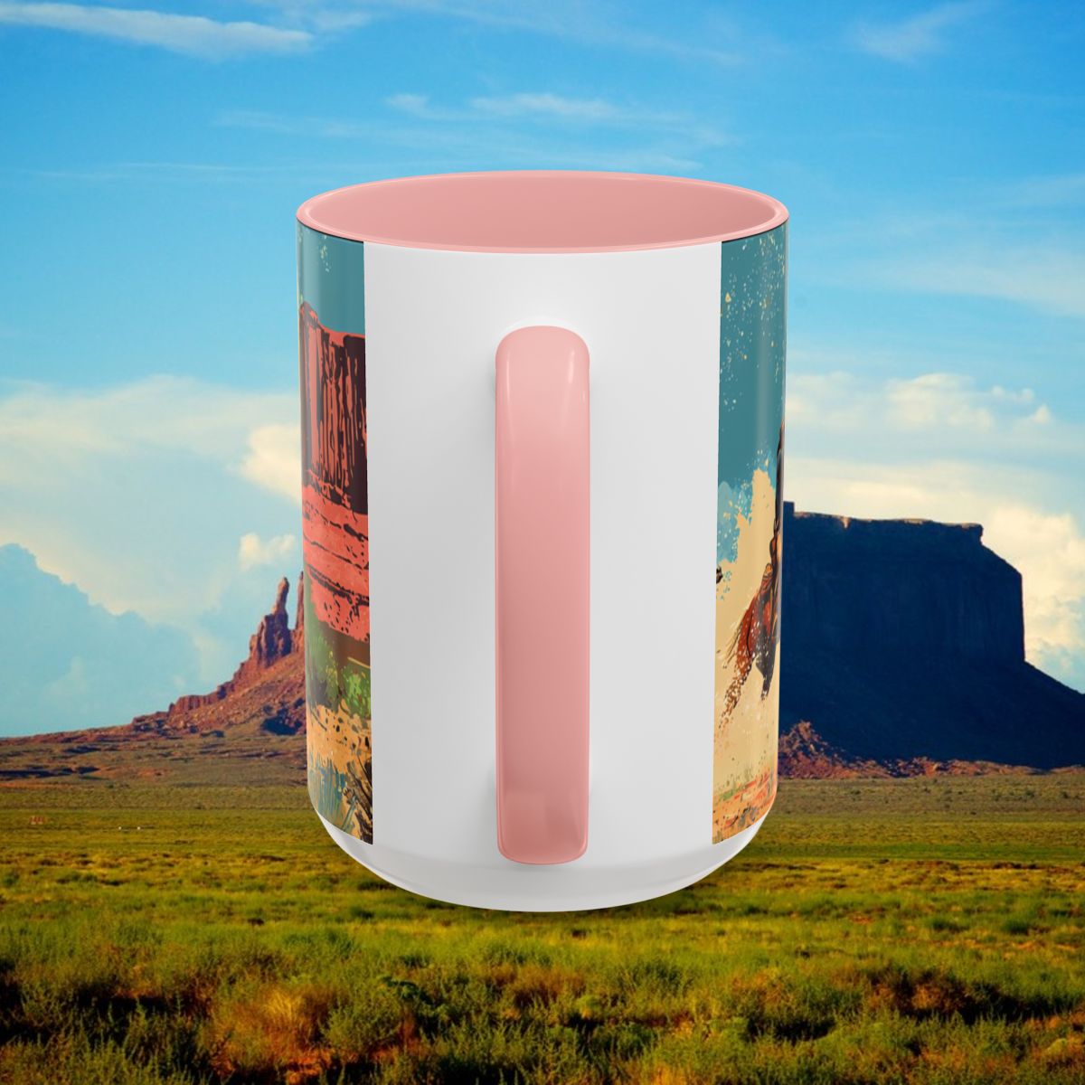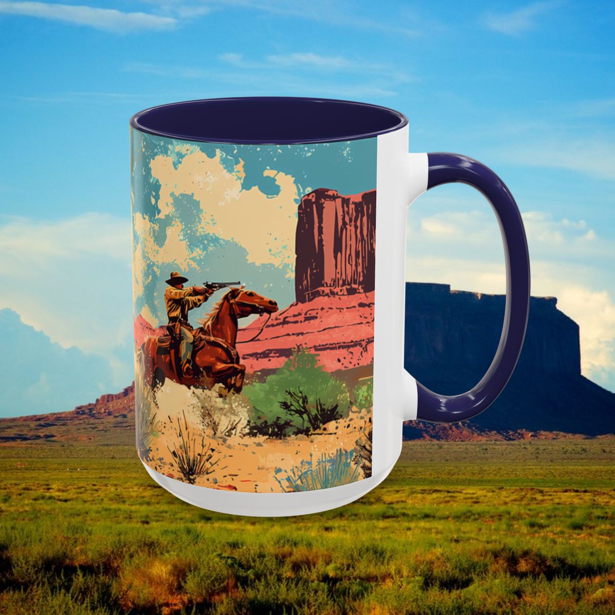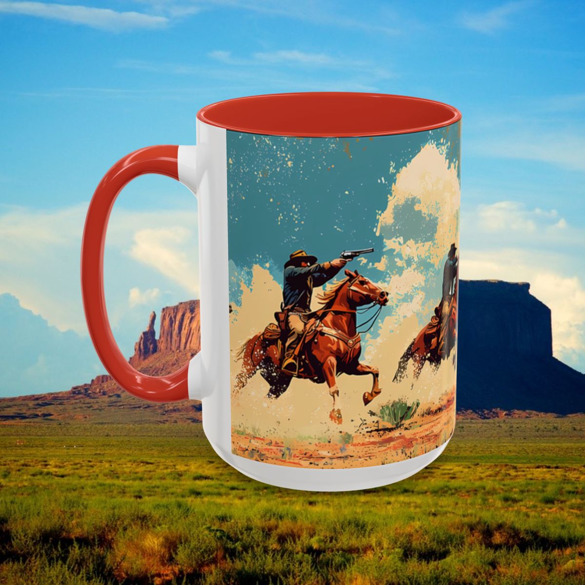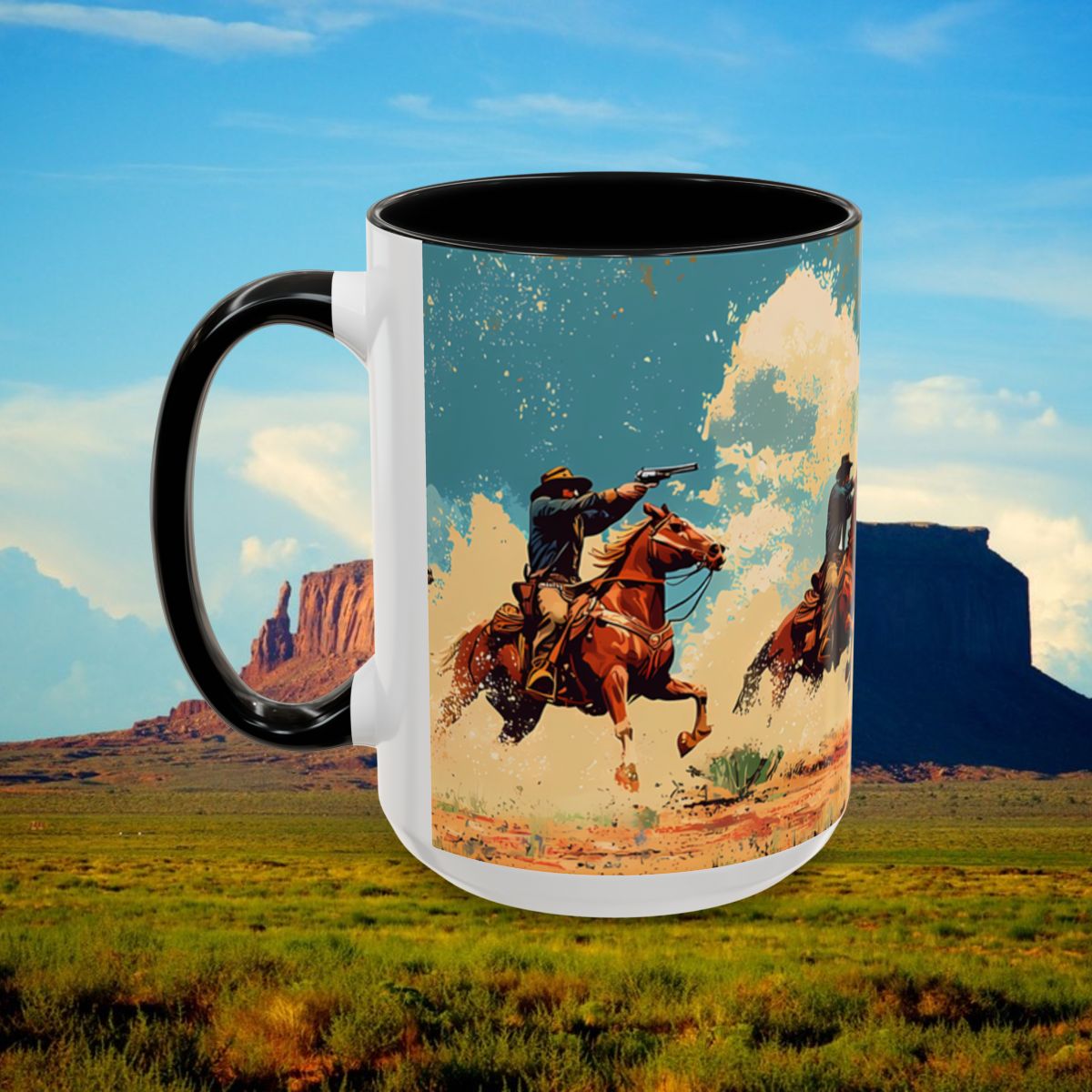 Embrace the cowboy southwestern western old west vibes with this accent coffee mug. Perfect for those who love rustic, vintage, and western themes. Ideal for those who enjoy sipping their morning coffee or tea while daydreaming about the wild west. Relevant for cowboys, cowgirls, and fans of western movies and TV shows. Great for Western-themed parties, cowboy festivals, and rodeo events.