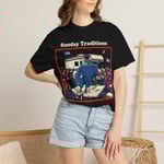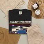 This heavyweight, garment-dyed tee feels like an old favorite from the moment you pull it on. The relaxed cut and soft, lived-in color come from dyeing the shirt after construction — that slightly faded, vintage tone that settles into your routine. The bold front artwork — a chaotic, late-night scene under the headline “Sunday Traditions” — reads like a story you want to retell. It’s sturdy where it matters: double-needle stitching on all seams, pre-shrunk ring-spun cotton, and a tubular knit that keeps the silhouette clean. Sized S–4XL and available in many colors, it works for folks who want a durable, comfortable tee with personality and a worn-in look that only gets better with time.