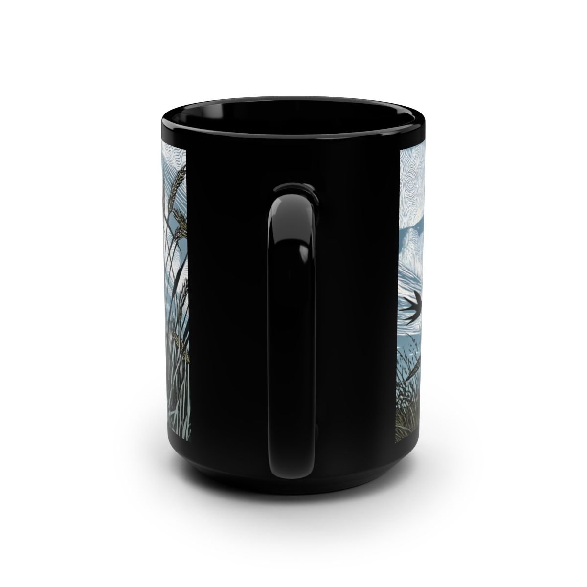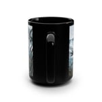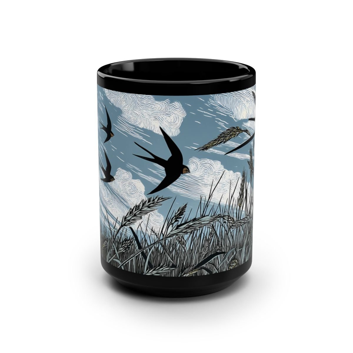 Swallow birds on farm field linocut design black ceramic mug perfect for bird lovers and nature enthusiasts. This mug gives a rustic and serene vibe, ideal for enjoying a hot beverage on a chilly day. Suitable for adults and great for celebrating birthdays, holidays, or simply adding a touch of nature to your daily routine.