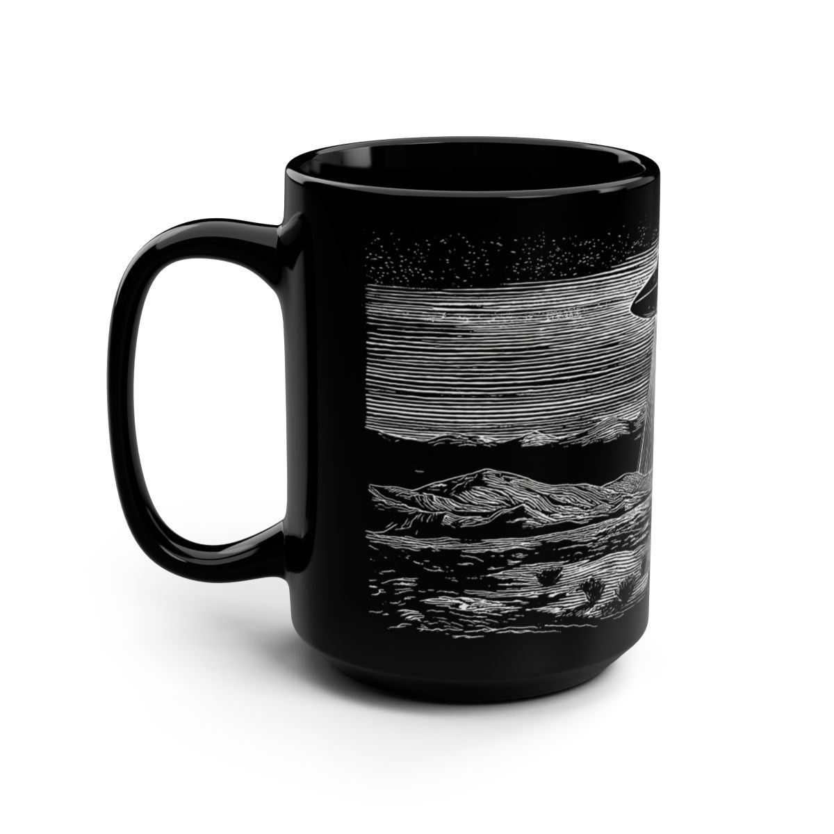 Deep, inky black ceramic wraps around a moody monochrome scene: a lone UFO hovers over a rough, moonlit landscape as a beam of light cuts through the night. This 15 oz mug holds a generous pour of coffee or tea and speaks to late-night stargazers, sci-fi readers, and anyone who loves a little mystery with their morning ritual. The glossy finish makes the illustrated details pop while the sturdy C-handle gives a confident grip for slow-sipping moments. Use it for quiet dawn watches, long creative sessions, or as a companion during weekend movie marathons.