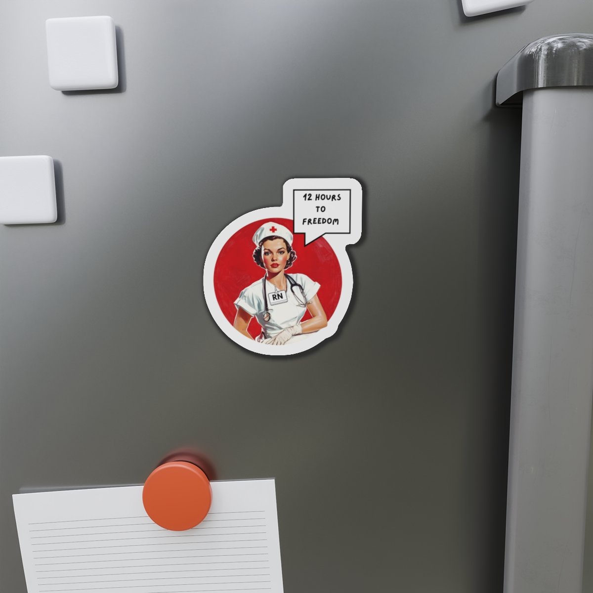 A bold die-cut magnet that blends vintage nurse pin-up art with a cheeky speech bubble — small rebellion for scrubs, lockers, and fridges. The matte surface keeps colors rich without glare, while the flexible vinyl backing and magnetic layer cling to metal surfaces like whiteboards, lockers, and refrigerators. It reads like a secret badge of solidarity for long shifts and late-night handoffs, adding character to break rooms, medical carts, or home kitchens. The compact shape and crisp contour cut follow the design so it stands out without taking up space. Durable enough to travel between workstations or outdoor gear, it stays bright and intact through daily wear.